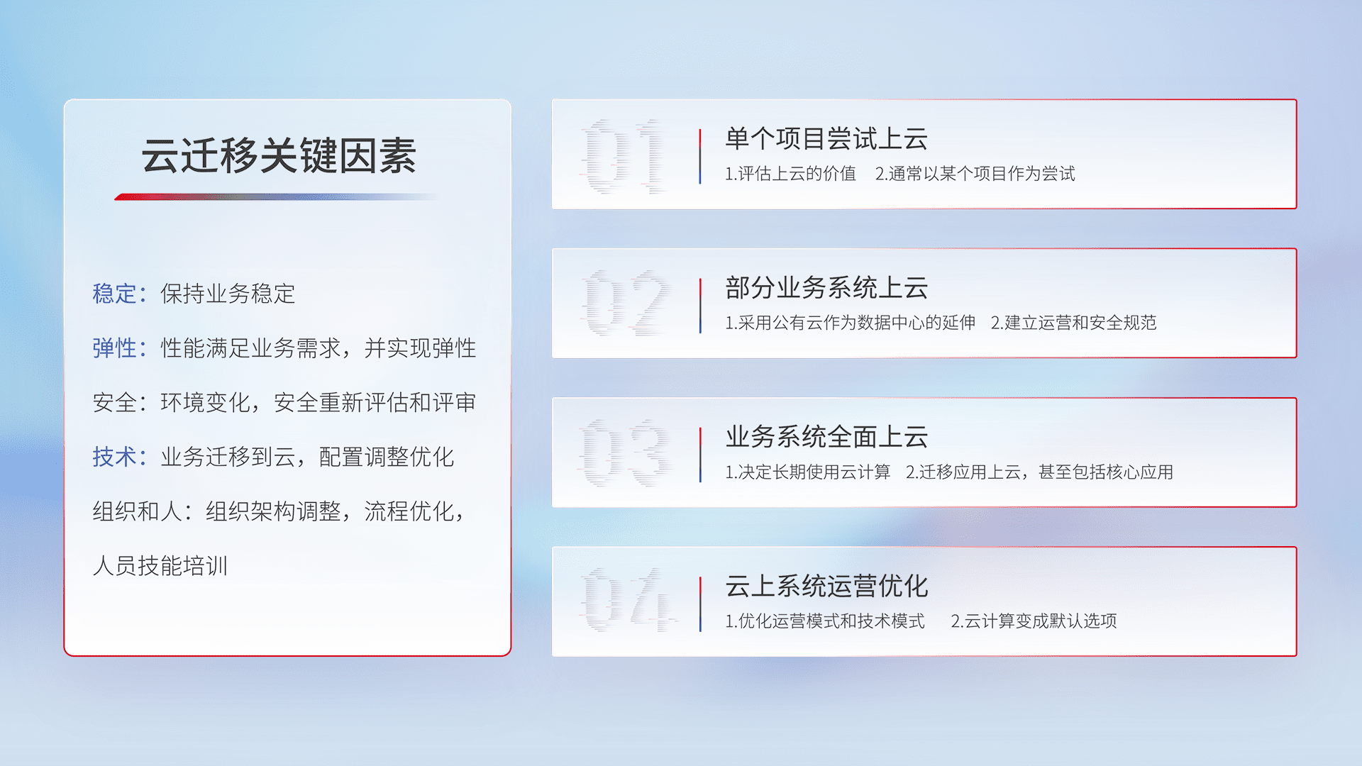 结合实际业务,,,,从规划设计、、、云平台选型、、、、云原生改造、、、数据迁移、、、、集成交付,,迁移全过程为客户识别最佳上云路径,,,,做好风险识别管理,,,设计网络架构、、身份权限、、安全审计合规、、、、操作审计、、日志审计、、监控告警策略、、、多站点容灾设计等,,对云上基础设施进行整体规划,,提升IT治理水平,,以满足弹性、、高可用、、、、高性能的需求。。。