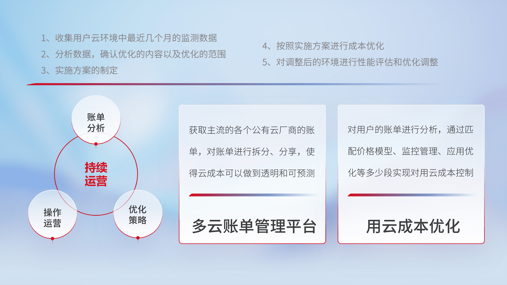 通过多云纳管,,,以统一的资源数据模型把客户的云资源进行抽象和封装,,,,进而实现对多云资源的统一操作,,,,保障云资源管理的可靠性、、稳定性与可用性。。。量身定制化运维内容,,,,配置、、开发运维、、、补丁管理、、、、备份、、、监控、、、认证和访问管理、、审计和日常巡检等,,,保障在用云过程中的可靠度,,,稳定度以及高可用率。。。。